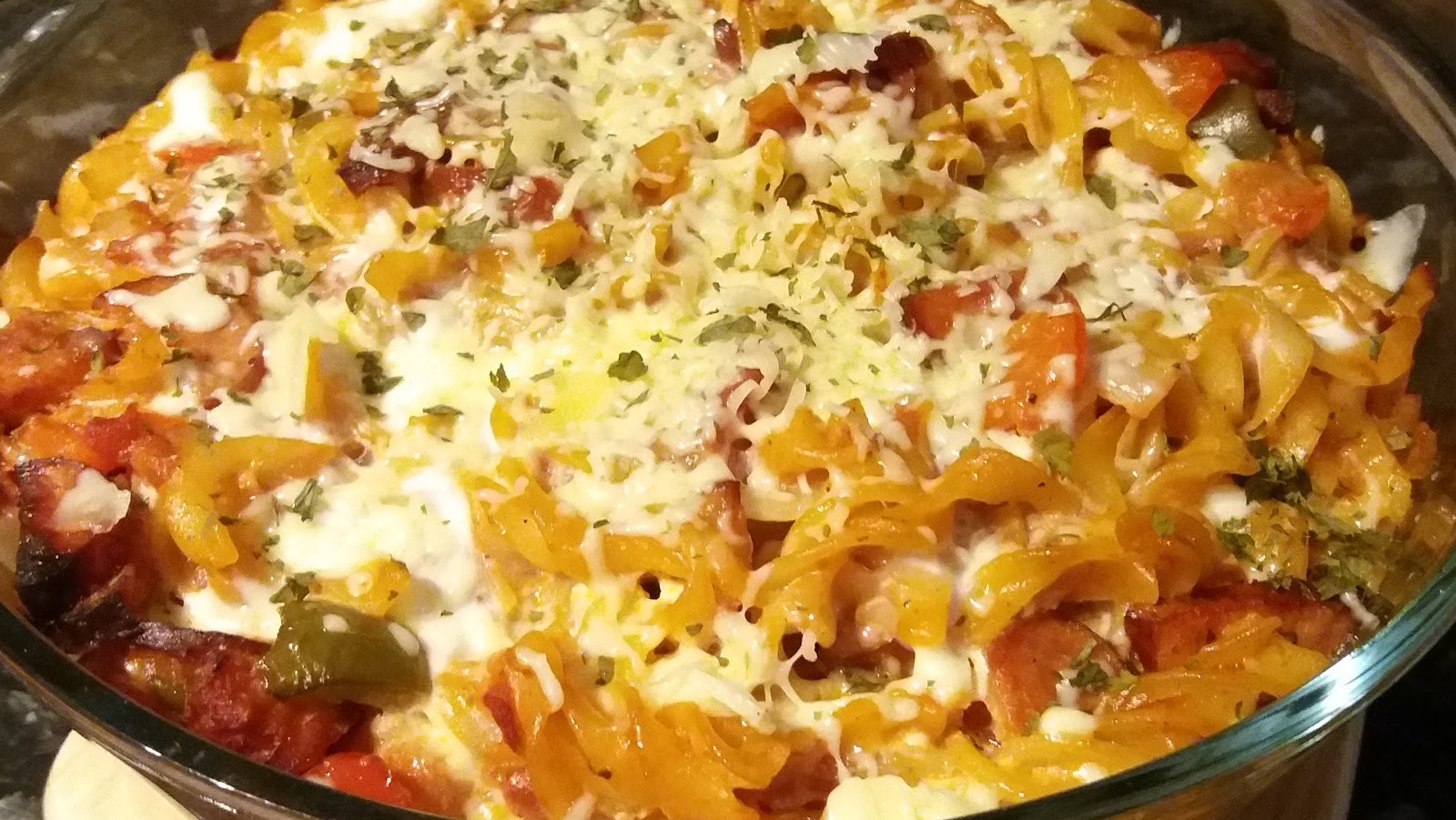jajkiem,polewamy makaron z warzywami. Posypujemy startym żółtym serem Zapiekamy ok.20 minut w 180°C.